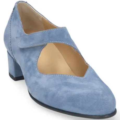 Bandschoen van Durea met een klittenband en een slanke neus in licht blauw suede Geschikt voor extra brede voeten en uw eigen steunzool op een K wijdte, op de leest 008 met een lage hak van 3 cm. De rand bij de wreef loopt gegolfd waardoor die minder snel zal snijden. De schoen heeft een TPU zool met polstering onder de voorvoet. ||Durea is een Nederlands fabricaat, met diverse leesten en wijdtematen. Het ontwerp en de afwerking geschiedt in Drunen. De productie vindt in het buitenland plaats, waar Durea eigen fabrieken bezit, onder toezicht van eigen mensen. Iedere schoen ondergaat ca 200 handelingen, Daar Durea alles in eigen beheer heeft kunnen zij hun hoge kwaliteit waarborgen.