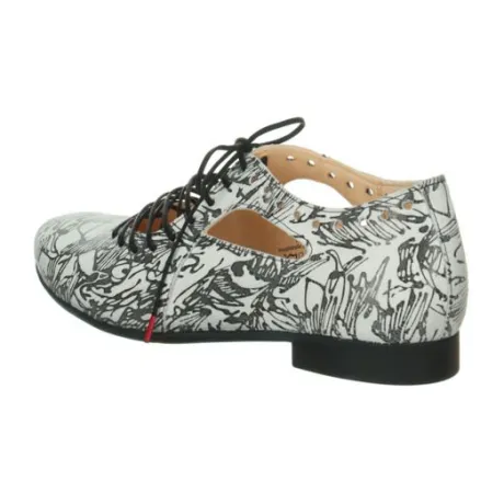 Open gewerkte veterschoen van Think in zwart met licht grijs leer met een platte hak. De schoen is leer gevoerd. Gemaakt op de leest Guad 2. De voetbedden zijn uitneembaar, dus ze zijn geschikt voor uw eigen steunzool. ||Think is een merk wat uit Oostenrijk komt en bekend staat om hun eigenzinnige collectie vervaardigd uit mooie en aparte materialen. De meeste voetbedden zijn uitneembaar. Het leer wordt plantaardig gelooid. Think maakt geen wijdte maten, maar de schoenen worden vaak op een bredere leest gemaakt.