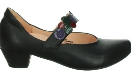 Bandschoen van Think in zwart leer met een klittenband over de wreef te verstellen is. Vaste Think klanten herkennen vast deze leest met een aparte hak die net iets hoger is waardoor de schoen goed bij iets gekleeds te dragen is. De hak is ca 3 cm hoog en comfortabel met lopen. Gemaakt op de leest Aida die zich al meer als bewezen heeft en aan veel voeten lekker zit. Think maakt niet echt wijdtematen, maar is vaak geschikt voor een vollere voet. De voetbedden zijn uitneembaar en de schoen is dus geschikt voor eigen steunzool. ||Think is een merk uit Oostenrijk en kenmerkt zich door aparte ontwerpen, met een prima pasvorm, gemaakt uit de beste leersoorten, die vaak plantaardig gelooid zijn.