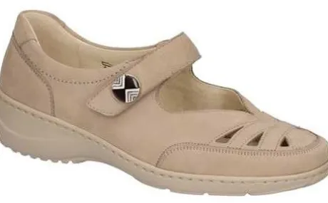 Bandschoen van Waldlaufer geschikt voor een brede voet op een brede K wijdte in beige nubuck op de leest Kya. Op het voorblad is de schoen open gewerkt, waardoor die lekker luchtig is. Op de wreef is de bandschoen te verstellen met een klittenband. De hak is bijna plat en de schoen is licht van gewicht. De voetbedden zijn uitneembaar en daardoor is de schoen geschikt voor uw eigen steunzool. ||Waldlaufer is een Duits merk. Kenmerkend is dat ze licht zijn van gewicht en zacht van leer. Er zijn verschillende wijdtematen en meestal zijn de voetbedden uitneembaar.