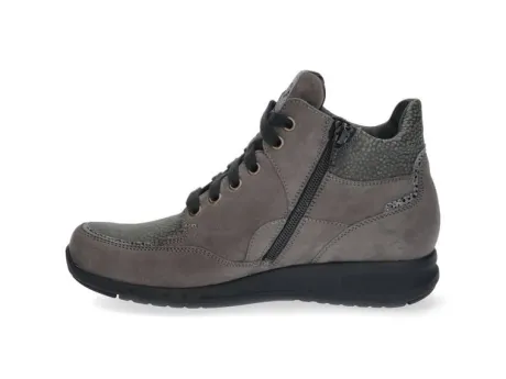 Boot van Durea op de Go zool in grijs nubuck in combinatie met een fijne print op de spiegel en bij de polstering om de enkel. Gemaakt op een bijna platte sleehak. Aan de zijkant zit een rits waardoor die makkelijk is aan en uit te trekken. De innovatie van de Go zool zorgt voor een ideaal looppatroon en stimuleert daarmee een natuurlijke houding van het lichaam waarbij het lopen vergemakkelijkt wordt. De boots zijn lichter van gewicht, soepel met dragen en zorgen voor veel demping en stabiliteit. Uitermate geschikt bij een hallux valgus, hallux rigidus, hielspoor, peesplaatontsteking en reuma. Goed te verstellen met een veter, daarbij is de boot gemaakt op een gebroken wijdte dwz dat de boot in de hielpartij smaller is, waardoor die extra goed om de hiel sluit. De zool is van PU en de hak is 1,7 cm hoog. Gemaakt op een G wijdte op de leest 684. Uiteraard heeft de boot een stevig contrefort en een uitneembaar voetbed. ||Durea is een Nederlands fabricaat, met diverse leesten en wijdtematen. Het ontwerp en de afwerking geschiedt in Drunen. De productie vindt in het buitenland plaats, waar Durea fabrieken bezit, onder toezicht van eigen mensen. Iedere schoen ondergaat ca 200 handelingen, Daar Durea alles in eigen beheer heeft kunnen zij hun hoge kwaliteit waarborgen. Durea koopt u online bij Ruttenschoenen.nl