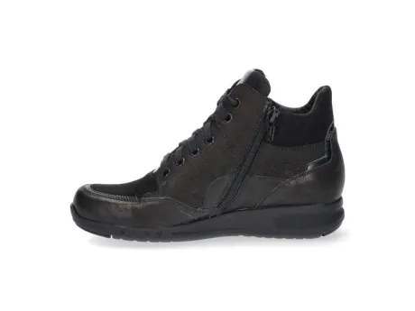Boot van Durea op de Go zool in zwart leer met nubuck op een bijna platte sleehak. Aan de zijkant zit een rits waardoor die makkelijk is aan en uit te trekken. De innovatie van de Go zool zorgt voor een ideaal looppatroon en stimuleert daarmee een natuurlijke houding van het lichaam waarbij het lopen vergemakkelijkt wordt. De boots zijn lichter van gewicht, soepel met dragen en zorgen voor veel demping en stabiliteit. Uitermate geschikt bij een hallux valgus, hallux rigidus, hielspoor, peesplaatontsteking en reuma. Goed te verstellen met een veter, daarbij is de boot gemaakt op een gebroken wijdte dwz dat de boot in de hielpartij smaller is, waardoor die extra goed om de hiel sluit. De zool is van PU en de hak is 1,7 cm hoog. Gemaakt op een extra brede K wijdte op de leest 688. Uiteraard heeft de boot een stevig contrefort en een uitneembaar voetbed. ||Durea is een Nederlands fabricaat, met diverse leesten en wijdtematen. Het ontwerp en de afwerking geschiedt in Drunen. De productie vindt in het buitenland plaats, waar Durea fabrieken bezit, onder toezicht van eigen mensen. Iedere schoen ondergaat ca 200 handelingen, Daar Durea alles in eigen beheer heeft kunnen zij hun hoge kwaliteit waarborgen. Durea koopt u online bij Ruttenschoenen.nl