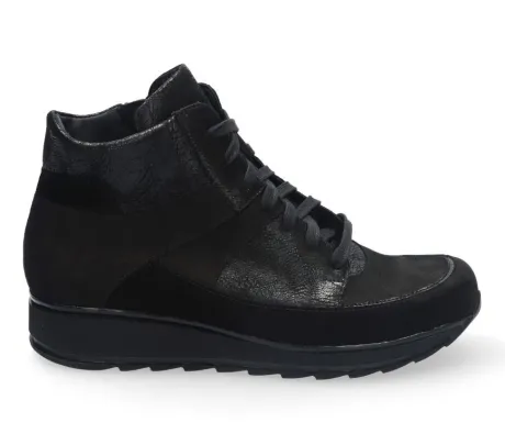 Sneakerboot van Durea in een zwart suede gecombineerd met een fijne glimmende print. Gemaakt op een brede H wijdte op de leest 685. Aan de zijkant zit een rits waardoor die makkelijk is aan en uit te trekken. Geschikt voor brede voeten met een uitneembaar voetbed waarvoor u uw eigen steunzool kunt vervangen. De schoen is stabiel en slijtvast en biedt veel demping bij de voorvoet. De schoen is gemaakt op een gebroken wijdte dwz dat de schoen in de hielpartij smaller is, waardoor die extra goed om de hiel sluit. De zool is van Eva gemaakt en de hak is 1,7 cm hoog. De zool heeft een extra afwikkeling. ||Durea is een Nederlands fabricaat, met diverse leesten en wijdtematen. Het ontwerp en de afwerking geschiedt in Drunen. De productie vindt in het buitenland plaats, waar Durea eigen fabrieken bezit, onder toezicht van eigen mensen. Iedere schoen ondergaat ca 200 handelingen, Daar Durea alles in eigen beheer heeft kunnen zij hun hoge kwaliteit waarborgen. Durea koopt u offline en online bij Ruttenschoenen.nl