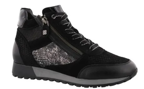 Sneakerboot van Helioform met een zijrits in zwart suede met leer en een sierprint. Door de rits zijn ze makkelijk uit en aan te trekken. Gemaakt op een extra brede K wijdte op de leest 293 met een bijna platte hak en stabiele zool. De voetbedden zijn uitneembaar en ze zijn dus geschikt voor eigen steunzool. ||Helioform is een Nederlands fabrikaat in een populaire prijsklasse, de schoenen worden in Nederland ontworpen en tegenwoordig onder streng toezicht voor goede arbeidsomstandigheden in India gemaakt. Ze maken verschillende wijdtematen en meestal zijn ze geschikt voor eigen steunzool.