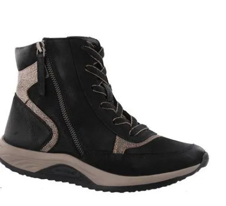 Sneakerboot van Helioform met een zijrits in zwart met brons nubuck. Door de rits zijn ze makkelijk uit en aan te trekken. Gemaakt op een brede H wijdte met een extra makkelijk afwikkelende stabiele zool. Hierdoor wordt het lopen vergemakkelijkt. De voetbedden zijn uitneembaar en ze zijn dus geschikt voor eigen steunzool. ||Helioform is een Nederlands fabrikaat in een populaire prijsklasse, de schoenen worden in Nederland ontworpen en tegenwoordig onder streng toezicht voor goede arbeidsomstandigheden in India gemaakt. Ze maken verschillende wijdtematen en meestal zijn ze geschikt voor eigen steunzool.