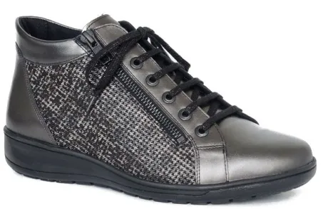 Boot van Solidus verstelbaar met een veter in midden grijs leer met aan de zijkant een breilook print. Aan de buitenzijde zit een rits waardoor de boot makkelijk is aan en uit te trekken. Op een lage hak van ca 25 mm. Geschikt voor uw eigen steunzool op een extra brede K wijdte, op de leest Kate. Deze boot is met name geschikt voor een brede voet. ||Solidus is een Duits fabricaat, met diverse leesten en wijdtematen, van smal tot super breed. Ze gebruiken zachte leersoorten, waardoor ze vaak zeer comfortabel en geschikt voor gevoelige voeten zijn. Vor de zeer gevoelige en of diabete voet, maken ze ook nog een speciale collectie “Solicare” Veel leesten en artikelen komen vaak weer terug, veelal in een andere uitvoering. Solidus koopt u off en online bij Ruttenschoenen.nl