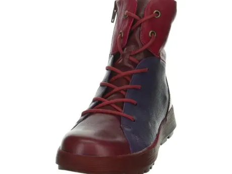 Boot van Think in paars met bordeaux en rood leer met bij de enkels een zachte polstering. De boot heeft een bijna platte hak en een profielzool. Gemaakt op de leest Comoda deze leest heeft extra ruimte bij de tenen in de breedte. Think maakt niet echt wijdtematen, maar is vaak geschikt voor een vollere voet. De boot heeft een wollen voering. De voetbedden zijn uitneembaar, dus geschikt voor eigen steunzool. ||Think is een merk uit Oostenrijk en kenmerkt zich door aparte ontwerpen, met een prima pasvorm, gemaakt uit de beste leersoorten, die vaak plantaardig gelooid zijn.