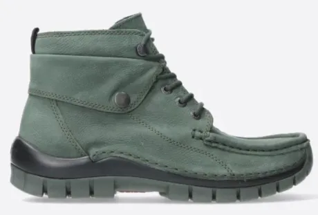 Boot van Wolky in groen nubuck in combinatie met een donkere zool. De boot is verstelbaar met een veter. Geschikt voor uw eigen steunzool. Op de leest Up2 De boot heeft een mocassin naad over de voet, is zeer comfortabel en heeft een platte hak van ca 25mm en een profiel zool. De boot heeft een teruggeslagen sierklepje. ||Wolky is een Nederlands merk, wat grotendeels in Portugal geproduceerd wordt. Ze hebben vaak een wat bredere leest en bieden ook vaak goed ruimte bij de tenen. Kenmerkend zijn de zachte zolen waarop u verend loopt. Het lopen op wolken effect. Wolky wordt dan ook vaak als zeer comfortabel ervaren. Wolky koop je online bij ruttenschoenen.nl