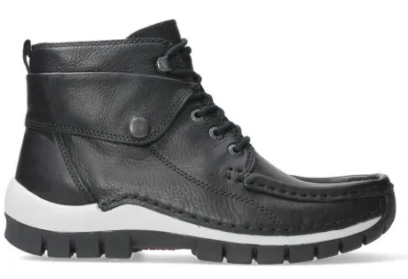 Boot van Wolky in zwart leer in combinatie met een witte rand bij de zool. De boot is verstelbaar met een veter. Geschikt voor uw eigen steunzool. Op de leest Up2 De boot heeft een mocassin naad over de voet, is zeer comfortabel en heeft een platte hak van ca 25mm en een profiel zool. De boot heeft een teruggeslagen sierklepje. ||Wolky is een Nederlands merk, wat grotendeels in Portugal geproduceerd wordt. Ze hebben vaak een wat bredere leest en bieden ook vaak goed ruimte bij de tenen. Kenmerkend zijn de zachte zolen waarop u verend loopt. Het lopen op wolken effect. Wolky wordt dan ook vaak als zeer comfortabel ervaren. Wolky koop je online bij ruttenschoenen.nl