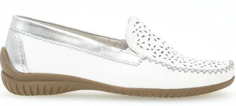 Een oude bekende mocassin van Gabor weer helemaal terug van weggeweest. In wit leer met zilveren accenten op een wijdte G. De spiegel is geperforeerd. Aan de zijkanten zit elastiek waardoor die beter aansluit. Door de eigenschappen van een mocassin maakwijze is de schoen licht van gewicht en soepel met dragen. Wel moet je ze goed inspuiten want door de stiknaden zijn ze gevoeliger voor vocht. Deze schoen is niet geschikt voor uw eigen steunzool. ||Gabor is een Duits fabricaat, met diverse leesten en wijdtematen. Ze staan bekend om hun goede leesten en zachte leersoorten. Modisch comfortabel tegen betaalbare prijzen. Sommige hebben een uitneembaar voetbed. Gabor koop je online bij Ruttenschoenen.nl
