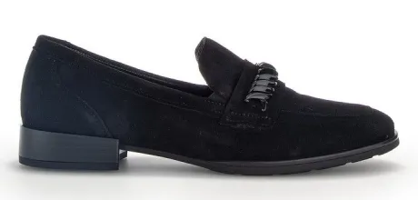 Geklede instapper van Gabor in zwart suede met een spiegel op een wijdte G op de leest Rhodos. Aan de zijkanten zit elastiek waardoor die beter aansluit. Over de wreef zit een fijne sierketting en de schoen heeft een bijna platte hak. De schoen heeft een voetbed die er niet uit te halen is en is niet geschikt voor eigen steunzool. ||Gabor is een Duits fabricaat, met diverse leesten en wijdtematen. Ze staan bekend om hun goede leesten en zachte leersoorten. Modisch comfortabel tegen betaalbare prijzen. Sommige hebben een uitneembaar voetbed. Gabor koop je online bij Ruttenschoenen.nl