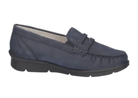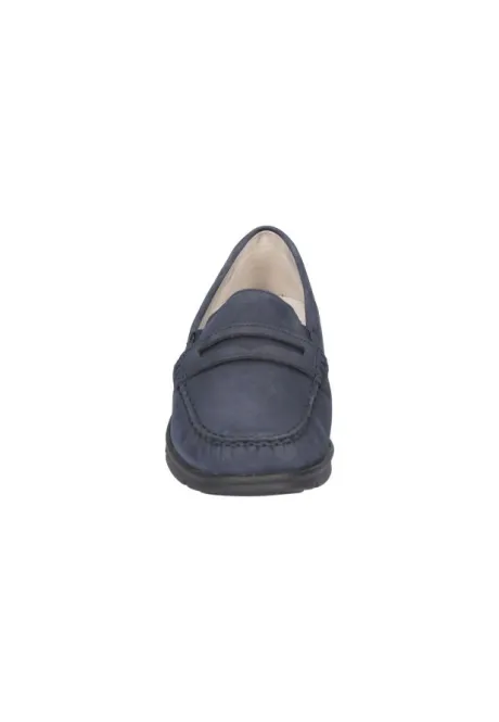 Mocasin pennyloafer van Waldlaufer gemaakt op een extra brede K wijdte in blauw nubuck op de leest Kinga. Aan beide zijden zit elastiek waardoor een betere sluiting. Op de wreef zit een sierband waar men vroeger een penny in deed, vandaar de naam. De hak is bijna plat en de schoen is licht van gewicht. De voetbedden zijn uitneembaar en daardoor is de schoen geschikt voor uw eigen steunzool. ||Waldlaufer is een Duits merk. Kenmerkend is dat ze licht zijn van gewicht en zacht van leer. Er zijn verschillende wijdtematen en meestal zijn de voetbedden uitneembaar.