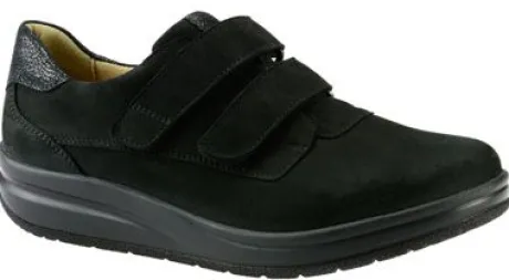 Super brede klittenbandschoen van Hartjes in zwart nubuck met zwart geprent leer bij de hiel. Met name geschikt voor de diabetische voet. De schoen is met klittenband te verstellen. Gemaakt op een superbrede M wijdte met extra afwikkeling in de zool en is geschikt voor uw eigen steunzool. Heeft een bijna platte sleehak. Is vervaardigd uit zacht plantaardig gelooide leersoorten. Kenmerkend is het lichte gewicht en het zachte gevoel met lopen. De schoen is gevoerd met Dry Clim wat tevens op het voetbed over het kurk zit, waardoor het uitwasbaar is. ||Hartjes is een Oostenrijks merk wat al sinds 1953 comfortabel schoeisel produceert, met de hoogste kwaliteit en een rijke traditie van Oostenrijks schoenmakershandwerk. Het is een echt groen merk en produceren uitsluitend milieu vriendelijk in het hart van europa, met goede vakmensen, die onder goede omstandigheden werken. Innovatief , zoals het geintegreerde , uitneembare lichtgewicht kurkvoetbed, natuurlijke voeringmaterialen als lamvel en walkloden (100% zuiver scheerwol), de plantaardig gelooide leersoorten. Hartjes verwerkt alleen hoogwaardige leersoorten. Ze beschermen de voet door haar robuustheid, de binnenzijde voelt zijdezacht aan en door haar natuurlijke, nerfstructuur maakt het iedere schoen uniek.