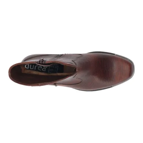 Westernlaars van Durea in bruin leer met een print en een rits aan de binnenzijde. Gemaakt op een extra brede K wijdte op de leest 998 met de TPU zool Veerle. Bij de hak en de voorzijde een zilverkleurige bit. Dit laarsje heeft een hakhoogte van 33 mm en is geschikt voor uw eigen steunzool. Uiteraard heeft de laars een stevig contrefort. ||Durea is een Nederlands fabricaat, met diverse leesten en wijdtematen. Het ontwerp en de afwerking geschiedt in Drunen. De productie vindt in het buitenland plaats, waar Durea fabrieken bezit, onder toezicht van eigen mensen. Iedere schoen ondergaat ca 200 handelingen, Daar Durea alles in eigen beheer heeft kunnen zij hun hoge kwaliteit waarborgen.