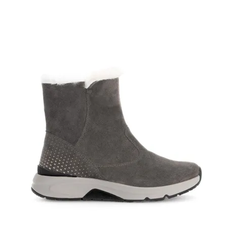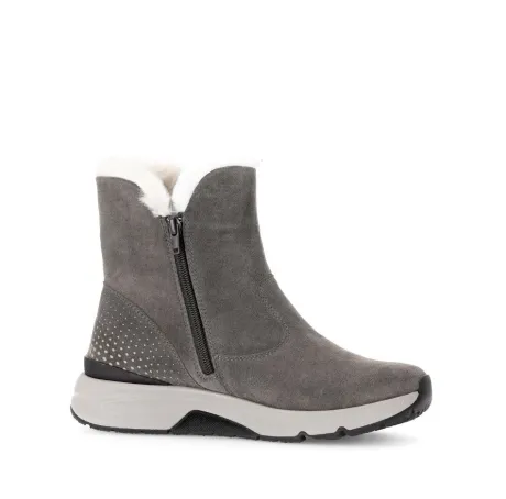 Korte laars van Gabor in taupe suede met een bontrandje met een Rolling soft zool. Deze leest heeft een speciale zool waarbij het lopen vergemakkelijkt wordt. Aan de binnenzijde zit een rits, waardoor die makkelijk aan en uit te tekken is. Het voetbed is uitneembaar, dus geschikt voor uw eigen steunzool. De laar heeft een bijna platte hak. ||Gabor is een Duits fabricaat, met diverse leesten en wijdtematen. Ze staan bekend om hun goede leesten en zachte leersoorten. Modisch comfortabel tegen betaalbare prijzen. Sommige hebben een uitneembaar voetbed. Gabor koop je online bij Ruttenschoenen.