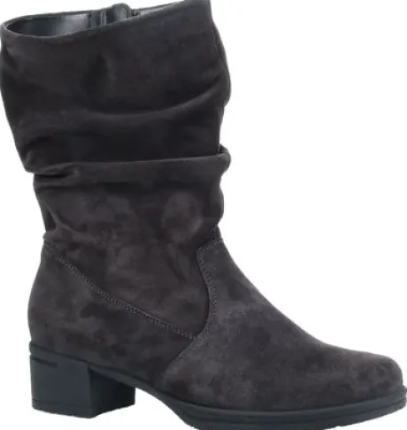 Half hoog Laarsje van Hartjes in het zwart suede op een brede H wijdte. De schacht is geplooid hierdoor heeft het een sportiever uiterlijk. Aan de binnenzijde zit een rits. De laars heeft een klein blokhakje en uitneembare voetbedden. Kenmerkend voor hartjes is het lichte gewicht en het zachte gevoel van lopen.