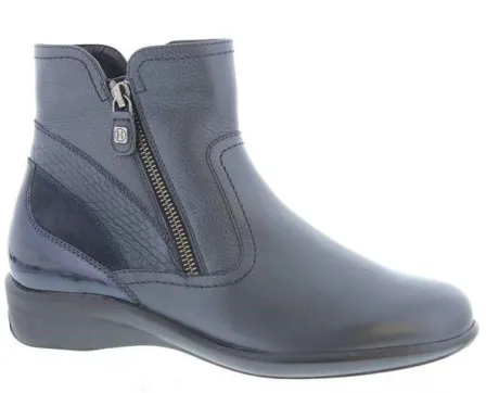 Korte laars van Helioform met 2 ritsen in zwart leer met suede en lak details. Door de 2 ritsen is het inschot ruimer en zijn ze makkelijk uit en aan te trekken. Gemaakt op een extra brede K wijdte met een bijna platte hak en een TPU zool. De voetbedden zijn uitneembaar en ze zijn dus geschikt voor eigen steunzool. ||Helioform is een Nederlands fabrikaat in een populaire prijsklasse, de schoenen worden in Nederland ontworpen en tegenwoordig onder streng toezicht voor goede arbeidsomstandigheden in India gemaakt. Ze maken verschillende wijdtematen en meestal zijn ze geschikt voor eigen steunzool.
