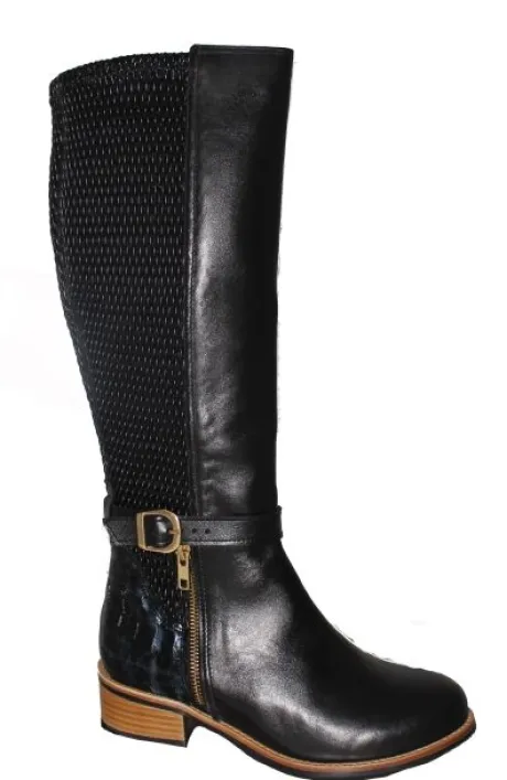 Lange laarzen zijn lastig op de webshop te bestellen omdat ze op verschillende plaatsen goed moeten zitten. En wij vaak dan weten wat u het beste kan passen. We adviseren dan ook om ze in de winkel te komen passen. ||Lange laars van Verhulst in zwart leer op een G wijdte op de leest Tess. Aan de achterzijde zit stretch materiaal waardoor die mooi aan de kuit sluit en ook voor een bredere kuit geschikt is. Bij de enkel zit een siergesp. De voetbedden zijn uitneembaar en daardoor is de laars geschikt voor uw eigen steunzool. De laars heeft een klein hakje van ca 25 mm en een stevig contrefort. ||Verhulst is een Nederlands fabrikaat, met diverse leesten en wijdtematen. Het ontwerp en de afwerking geschied in Tilburg. De productie vindt in het buitenland plaats, onder toezicht van eigen mensen. Verhulst koopt u online bij Ruttenschoenen.nl