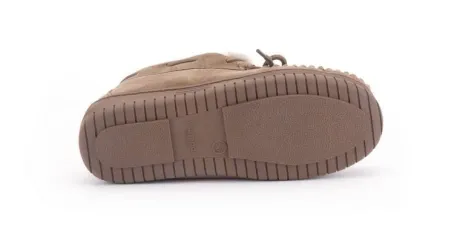 Pantoffel van Warmbat gevoerd met lamsvacht in zandkleurig suede die wat hoger bij de enkel zit. De pantoffel is lekker zacht op de huid en heeft een comfortabele antislip, slijtvaste en rubberen zool. ||||Warmbat komt uit Australie waar zij al meer dan 100 jaar wol van de merino schaap gebruiken. Er wordt 100% merino wol gebruikt wat het voordeel geeft van een goede kwaliteit en een goed ademend vermogen. De vezels kunnen tot 30% van het eigen gewicht aan vocht absorberen. ook is deze natuurlijke vacht temperatuur regulerend waardoor ze het hele jaar door zijn te dragen. Daarbij is het van natuur ook antibacterieel