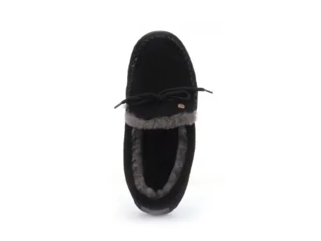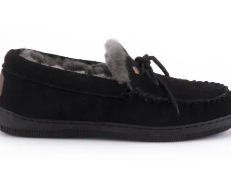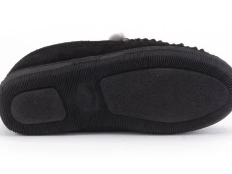 Pantoffel van Warmbat gevoerd met lamsvacht in zwart suede. Gemaakt op een mocassin maakwijze. De pantoffel is lekker zacht op de huid en heeft een comfortabele antislip, slijtvaste en schokdempende zool. ||||Warmbat komt uit Australie waar zij al meer dan 100 jaar wol van de merino schaap gebruiken. Er wordt 100% merino wol gebruikt wat het voordeel geeft van een goede kwaliteit en een goed ademend vermogen. De vezels kunnen tot 30% van het eigen gewicht aan vocht absorberen. ook is deze natuurlijke vacht temperatuur regulerend waardoor ze het hele jaar door zijn te dragen. Daarbij is het van natuur ook antibacterieel
