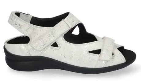 Sandaal van Durea in wit leer met een gemarmerd effect met licht grijs bewerkt op een G wijdte op leest 216. Deze sandaal is goed verstelbaar met drie klittebanden. De zool geeft een goede stabiliteit en demping met het lopen. De hakhoogte is 2 cm. en de zool is slijtvast. Het voetbed is uitneembaar, dus geschikt voor u eigen steunzool. ||Durea is een Nederlands fabricaat, met diverse leesten en wijdtematen. Het ontwerp en de afwerking geschiedt in Drunen. De productie vindt in het buitenland plaats, waar Durea eigen fabrieken bezit, onder toezicht van eigen mensen. Iedere schoen ondergaat ca 200 handelingen, Daar Durea alles in eigen beheer heeft kunnen zij hun hoge kwaliteit waarborgen. Durea koop je online bij ruttenschoenen.nl
