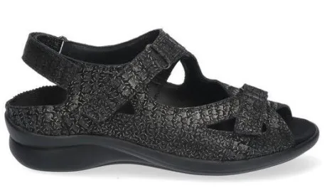 Sandaal van Durea in een zwart suede met een fantasieprint op een G wijdte op leest 216. Deze sandaal is goed verstelbaar met drie klittebanden. De zool geeft een goede stabiliteit en demping met het lopen. De hakhoogte is 2 cm. en de zool is slijtvast. Het voetbed is uitneembaar, dus geschikt voor u eigen steunzool. ||Durea is een Nederlands fabricaat, met diverse leesten en wijdtematen. Het ontwerp en de afwerking geschiedt in Drunen. De productie vindt in het buitenland plaats, waar Durea eigen fabrieken bezit, onder toezicht van eigen mensen. Iedere schoen ondergaat ca 200 handelingen, Daar Durea alles in eigen beheer heeft kunnen zij hun hoge kwaliteit waarborgen. Durea koop je online bij ruttenschoenen.nl