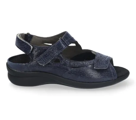 Sandaal van Durea in blauw leer met bij de bal van de voet stretch materiaal. De sandaal is verstelbaar met 2 klittenbanden op de voet en 1 aan de hielpartij. De sandaal is speciaal gemaakt voor superbrede en gevoelige voeten op een M wijdte op de leest 220. Het voetbed is uitneembaar dus geschikt voor uw eigen steunzool. De hak is stabiel en maar 2 cm hoog. De PU zool is schokabsorberend en geeft veel demping. De sandaal is gevoerd met Fashmoo en daardoor extra zacht aan de voeten. ||Durea is een Nederlands fabricaat, met diverse leesten en wijdtematen. Het ontwerp en de afwerking geschiedt in Drunen. De productie vindt in het buitenland plaats, waar Durea eigen fabrieken bezit, onder toezicht van eigen mensen. Iedere schoen ondergaat ca 200 handelingen, Daar Durea alles in eigen beheer heeft kunnen zij hun hoge kwaliteit waarborgen.