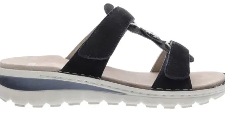 Slipper van Ara op een G wijdte op de leest Tampa in blauw suede met een sierknoop. De slipper is met 2 klittenbanden te verstellen en heeft een vast voetbed met een hielkom en is niet geschikt voor een steunzool. ||Ara is een Duits merk, die in vele landen zelf produceren. De schoenen zijn vaak zacht en licht van gewicht. Ze maken diverse wijdtes en leesten. De Duitse leest is vaak prima voor de Nederlandse voet. Sommige hebben een uitneembaar voetbed. Ara koopt u online bij Ruttenschoenen.nl