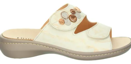 Slipper van Think met een bijna platte hak in room kleurig leer met een fijne print en een sierknoop op de wreef. De slipper is met leer gevoerd en gemaakt op de leest Camilla. Door de 2 klittebanden is die precies op maat voor de voet te maken. De voetbedden zijn uitneembaar. ||Think is een merk wat uit Oostenrijk komt en bekend staat om hun eigenzinnige collectie vervaardigd uit mooie en aparte materialen. De meeste voetbedden zijn uitneembaar. Het leer wordt plantaardig gelooid. Think maakt geen wijdte maten, maar de schoenen worden vaak op een bredere leest gemaakt. Think koopt u online bij Ruttenschoenen.nl