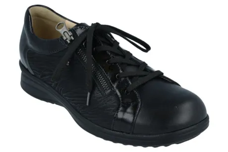Dames veter schoen van FinnComfort in zwart leer met suede en lak. Aan de zijkant zit een rits zodat die makkelijker is aan en uit te trekken. Op een extra brede leest ca een K wijdte, waarbij de voetbedden uitneembaar zijn en de schoen bij de tenen extra veel ruimte biedt. Met een antislipzool en een bijna platte hak van 25 mm. ||FinnComfort is een Duits merk , wat nog steeds in Duitsland wordt gemaakt en vaak ook deels nog handwerk is, dat merk je en dat voel je. De optimale pasvorm verzekert een schokabsorberende en natuurlijke afwikkeling van de voet. De schoen biedt veel ruimte bij de tenen, zoals het eigenlijk hoort. Er zijn verschillende types en leesten, waar FinnComfort geen wijdte aan verbindt, welke wij proberen aan te geven met welke wijdte dit overeenkomt. Finn Comfort koop je online Ruttenschoenen.nl