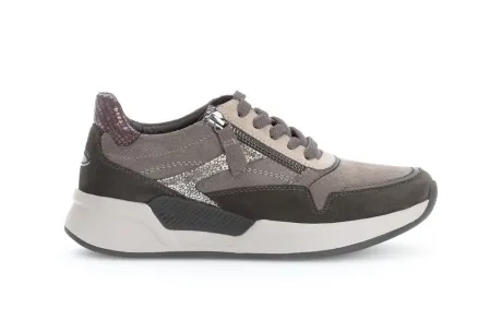 Sneaker van Gabor in bruin nubuck met metallic gecombineerd met taupe en beige. Gemaakt op een ca wijdte G op een Rolling soft onderwerk met een dikkere zool. Deze leest heeft een speciale zool waarbij het lopen vergemakkelijkt wordt. Aan de buitenzijde zit een rits, waardoor die makkelijk is aan en uit te tekken. Het voetbed is uitneembaar, dus geschikt voor uw eigen steunzool. De sneaker heeft een hakhoogte van ca 20 mm. ||Gabor is een Duits fabricaat, met diverse leesten en wijdtematen. Ze staan bekend om hun goede leesten en zachte leersoorten. Modisch comfortabel tegen betaalbare prijzen. Sommige hebben een uitneembaar voetbed. Gabor koop je online bij Ruttenschoenen.