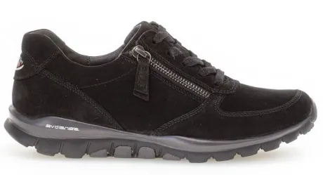 Sneaker van Gabor in zwart DriTan nubuck op een wijdte G op de leest GFP met een Rolling soft onderwerk. Deze leest heeft een speciale zool waarbij het lopen vergemakkelijkt wordt. Aan de 2 zijden zit een rits, waardoor die makkelijk is aan en uit te tekken. Met de DriTan techniek wordt er bij het vervaardigen minder water gebruikt, wat weer beter voor het milieu is. Het voetbed is uitneembaar, dus geschikt voor uw eigen steunzool. De sneaker heeft een hakhoogte van 20 mm. ||Gabor is een Duits fabricaat, met diverse leesten en wijdtematen. Ze staan bekend om hun goede leesten en zachte leersoorten. Modisch comfortabel tegen betaalbare prijzen. Sommige hebben een uitneembaar voetbed. Gabor koop je online bij Ruttenschoenen.