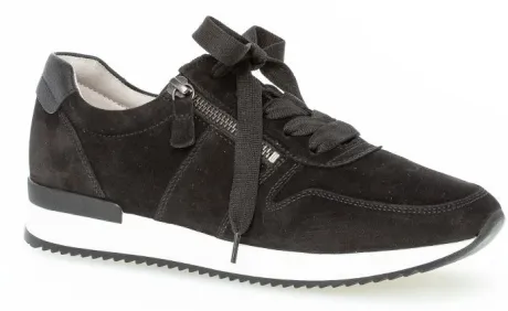 Gabor sneaker in zwart suéde op de wijdte G. Deze heeft 2 ritsen en een veter die als die eenmaal is ingesteld makkelijk aan en uit te trekken is. De veter is een sportieve lintveter. De hak is 15mm hoog.De schoen heeft een uitneembaar voetbed dus is geschikt voor u eigen zool. ||Gabor is een Duits fabricaat, met diverse leesten en wijdtematen. Ze staan bekend om hun goede leesten en zachte leersoorten. Modisch comfortabel tegen betaalbare prijzen. Sommige hebben een uitneembaar voetbed. Gabor koopt u online bij Ruttenschoenen.nl