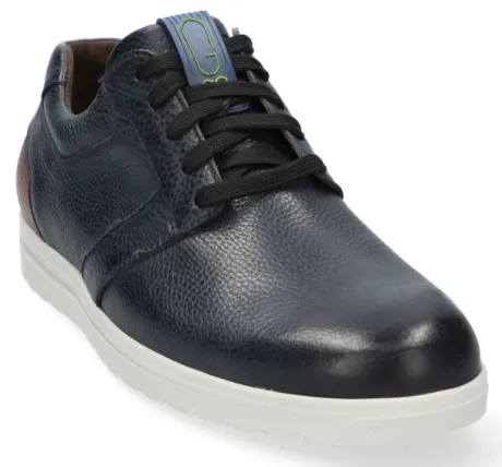 De Gijs Go schoenen zijn lichter van gewicht en hebben een speciaal ontwikkelde zool waarbij het lopen vergemakkelijkt wordt. Deze sneakers van Gijs zijn in blauw getrommeld leer met een cognac kleur hielinzet. Rond de enkels zit een polstering. De voetbedden zijn uitneembaar, dus de schoen is geschikt voor eigen steunzool. Gemaakt op een extra brede K wijdte op de leest 208. ||Gijs komt uit de koker van Durea en staat dus garant voor een goede kwaliteit en pasvorm. Jaren van ervaren ouderwetse vakmanschap ligt hieraan ten grondslag. Inmiddels al een aantal seizoenen verkrijgbaar verovert het zo zijn eigen plekje. Gijs koop je online bij Ruttenschoenen.nl
