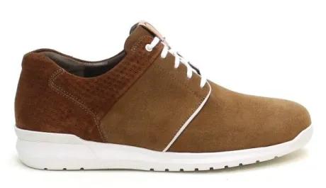 Sneaker van Gijs in cognackleurig suède met een fantasieprint bij de hiel. De schoen is er op een G wijdte op de leest 204. Vervaardigd uit kalfs suède met rubberen zool met Pu vulling, voor meer demping en een lichter gewicht. In de zool zit een lichte afwikkeling van 5 mm verwerkt, waardoor het lopen vergemakkelijkt wordt. De leestvorm is wat ronder voor meer ruimte bij de 3e en 4e teen en heeft een extra teensprong.De schoen heeft een uitneembaar voetbed en is dus geschikt voor uw eigen steunzool. ||Gijs komt uit de koker van Durea en staat dus garant voor een goede kwaliteit en pasvorm. Jaren van ervaren ouderwetse vakmanschap ligt hieraan ten grondslag. Inmiddels al een aantal seizoenen verkrijgbaar verovert het zo zijn eigen plekje. Gijs koopt u online bij Ruttenschoenen.nl