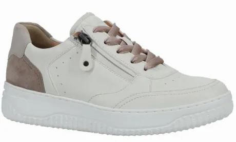Sneakers van Hartjes in off white leer met taupe en beige op een brede H wijdte op de nieuwe leest Boogie. Aan de zijkant zit een rits waardoor de schoen makkelijk is aan en uit te trekken. De sneaker heeft een dikkere aparte zool. De voetbedden zijn uitneembaar voetbed en daardoor is de schoen geschikt voor uw eigen steunzool. De schoen is vervaardigd uit zacht plantaardig gelooid leer. Kenmerkend is het lichte gewicht en het zachte gevoel met lopen. ||Hartjes is een Oostenrijks merk wat al sinds 1953 comfortabel schoeisel produceert met de hoogste kwaliteit en een rijke traditie van Oostenrijks schoenmakershandwerk. Het is een echt groen merk en produceren uitsluitend milieu vriendelijk in het hart van europa, met goede vakmensen, die onder goede omstandigheden werken. Innovatief , zoals het geïntegreerde , uitneembare lichtgewicht kurkvoetbed, natuurlijke voeringmaterialen als lamvel en walkloden (100% zuiver scheerwol), de plantaardig gelooide leersoorten. Hartjes verwerkt alleen hoogwaardige leersoorten. Ze beschermen de voet door haar robuustheid, de binnenzijde voelt zijdezacht aan en door haar natuurlijke, nerfstructuur maakt het iedere schoen uniek. Hartjes koopt u online bij Ruttenschoenen.nl