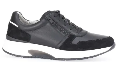 Rolling soft sneaker van Pius (de heren versie van Gabor). In zwart leer met suede en witte details. De Rolling soft is een techniek in de zool waarop die lekker afwikkelt en het lopen vergemakkelijkt wordt. Gemaakt op een ruime G 1/2 wijdte en met een uitneembaar voetbed.