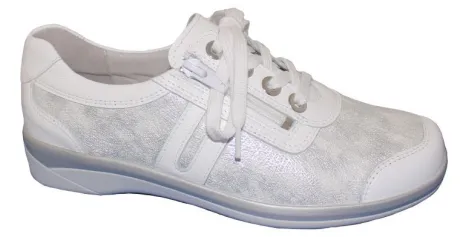 Sneaker met veter te verstellen van Stuppy in wit leer in combinatie met een licht beige fijne print op nubuck basis waarin stretch verwerkt is. Aan de zijkant zitten 2 ritsen, waardoor als de veter eenmaal is goed ingesteld de schoen makkelijk is aan en uit te trekken. Zeer geschikt voor voeten die gevoelig zijn. Gemaakt op een H wijdte. Het voetbed is uitneembaar en de schoen is dus geschikt voor uw eigen steunzool. De hak is bijna plat ca 20 mm. ||Stuppy is een specialistisch klein fabricaat ontstaan in de 50 er jaren, wat u niet overal zal tegenkomen. Ze maken o.a hoogwaardige pantoffels waar de voetbedden uitkunnen. Maar ook comfortabele dames en heren schoenen met uitneembare voetbedden. Er worden veelal stretch materialen gebruikt. Het is een echt comfort merk. Stuppy koopt u online bij Ruttenschoenen.nl