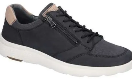 Sneaker van Waldlaufer op een brede H wijdte op de leest Heiko in blauw nubuck met beige accenten. Aan de zijkant zit een rits waardoor die makkelijk is aan en uit te trekken. Deze schoen heeft een uitneembaar voetbed en is daardoor geschikt voor uw eigen steunzool. ||Waldlaufer is een Duits merk. Kenmerkend is dat ze licht zijn van gewicht en zacht van leer. Ze maken verschillende wijdtematen en meestal zijn de voetbedden uitneembaar. Waldlaufer koop je online bij ruttenschoenen.nl