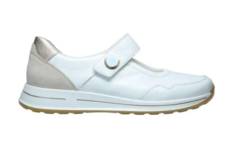 Bandschoen van Ara in offwhite leer met licht grijs en zilverkleur bij de hiel. De band is met klittenband te verstellen. De zool wikkelt extra makkelijk af en de hak is bijna plat. Gemaakt op een brede H wijdte op de leest Osaka. Het voetbed is uitneembaar, dus de schoen is geschikt voor uw eigen steunzool. ||Ara is een Duits merk, die in vele landen zelf produceren. De schoenen zijn vaak zacht en licht van gewicht. Ze maken diverse wijdtes en leesten. De Duitse leest is vaak prima voor de Nederlandse voet. Sommige hebben een uitneembaar voetbed. Ara koopt u online bij Ruttenschoenen.nl