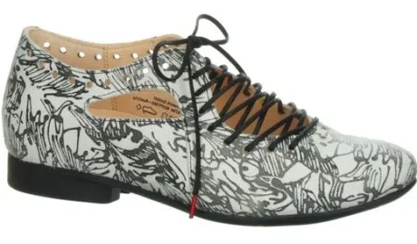 Open gewerkte veterschoen van Think in zwart met licht grijs leer met een platte hak. De schoen is leer gevoerd. Gemaakt op de leest Guad 2. De voetbedden zijn uitneembaar, dus ze zijn geschikt voor uw eigen steunzool. ||Think is een merk wat uit Oostenrijk komt en bekend staat om hun eigenzinnige collectie vervaardigd uit mooie en aparte materialen. De meeste voetbedden zijn uitneembaar. Het leer wordt plantaardig gelooid. Think maakt geen wijdte maten, maar de schoenen worden vaak op een bredere leest gemaakt.