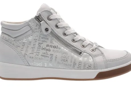 Sneakerboot van Ara op een G wijdte op de leest Rom in wit leer icm nubuck aan de zijkant met een zilveren print. Aan de zijkant zit een rits waardoor die makkelijk is aan en uit te trekken. De voetbedden zijn uitneembaar ||Ara is een Duits merk, die in vele landen zelf produceren. De schoenen zijn vaak zacht en licht van gewicht. Ze maken diverse wijdtes en leesten. De Duitse leest is vaak prima voor de Nederlandse voet. Sommige hebben een uitneembaar voetbed. Ara koopt u online bij Ruttenschoenen.nl