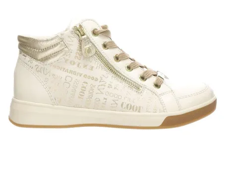 Sneakerboot van Ara in roomkleurig leer met champagne kleurige details. Aan de zijkant zit een rits waardoor die makkelijk is aan en uit te trekken. Gemaakt op een G wijdte op de leest Rom. Het voetbed is uitneembaar, dus de boot is geschikt voor uw eigen steunzool. ||Ara is een Duits merk, die in vele landen zelf produceren. De schoenen zijn vaak zacht en licht van gewicht. Ze maken diverse wijdtes en leesten. De Duitse leest is vaak prima voor de Nederlandse voet. Sommige hebben een uitneembaar voetbed. Ara koopt u online bij Ruttenschoenen.nl