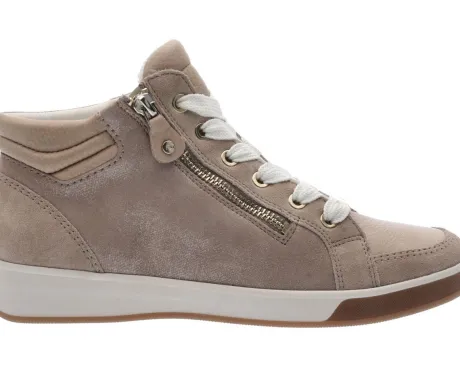 Sneakerboot van Ara op een G wijdte op de leest Rom in zandkleurig nubuck met suede en leer. Aan de zijkant heeft de boot een fijne print. Het High soft voetbed zorgt dat de boot zacht aan de voeten voelt. Aan de zijkant zit een rits waardoor die makkelijk is aan en uit te trekken. De voetbedden zijn uitneembaar ||Ara is een Duits merk, die in vele landen zelf produceren. De schoenen zijn vaak zacht en licht van gewicht. Ze maken diverse wijdtes en leesten. De Duitse leest is vaak prima voor de Nederlandse voet. Sommige hebben een uitneembaar voetbed. Ara koopt u online bij Ruttenschoenen.nl