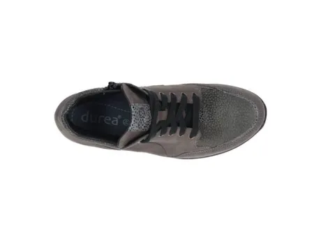 Boot van Durea op de Go zool in grijs nubuck in combinatie met een fijne print op de spiegel en bij de polstering om de enkel. Gemaakt op een bijna platte sleehak. Aan de zijkant zit een rits waardoor die makkelijk is aan en uit te trekken. De innovatie van de Go zool zorgt voor een ideaal looppatroon en stimuleert daarmee een natuurlijke houding van het lichaam waarbij het lopen vergemakkelijkt wordt. De boots zijn lichter van gewicht, soepel met dragen en zorgen voor veel demping en stabiliteit. Uitermate geschikt bij een hallux valgus, hallux rigidus, hielspoor, peesplaatontsteking en reuma. Goed te verstellen met een veter, daarbij is de boot gemaakt op een gebroken wijdte dwz dat de boot in de hielpartij smaller is, waardoor die extra goed om de hiel sluit. De zool is van PU en de hak is 1,7 cm hoog. Gemaakt op een G wijdte op de leest 684. Uiteraard heeft de boot een stevig contrefort en een uitneembaar voetbed. ||Durea is een Nederlands fabricaat, met diverse leesten en wijdtematen. Het ontwerp en de afwerking geschiedt in Drunen. De productie vindt in het buitenland plaats, waar Durea fabrieken bezit, onder toezicht van eigen mensen. Iedere schoen ondergaat ca 200 handelingen, Daar Durea alles in eigen beheer heeft kunnen zij hun hoge kwaliteit waarborgen. Durea koopt u online bij Ruttenschoenen.nl