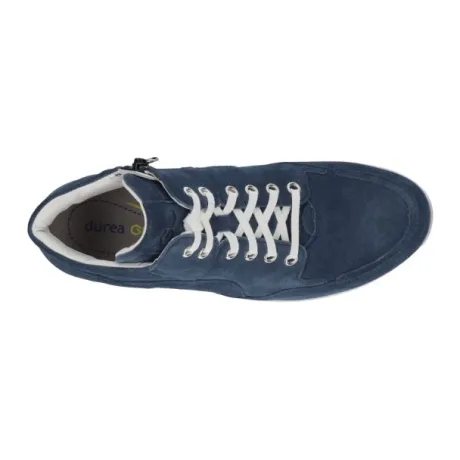 Boot van Durea op de Go leest in blauw suede met een bijna platte sleehak. Aan de zijkant zit een rits waardoor die makkelijk is aan en uit te trekken. De innovatie van de Go zool zorgt voor een ideaal looppatroon en stimuleert daarmee een natuurlijke houding van het lichaam waarbij het lopen vergemakkelijkt wordt. De boots zijn lichter van gewicht, soepel met dragen en zorgen voor veel demping en stabiliteit. Uitermate geschikt bij een hallux valgus, hallux rigidus, hielspoor, peesplaatontsteking en reuma. Goed te verstellen met een veter, daarbij is de boot gemaakt op een gebroken wijdte dwz dat de boot in de hielpartij smaller is, waardoor die extra goed om de hiel sluit. De zool is van PU en de hak is 1,7 cm hoog. Gemaakt op een G wijdte op de leest 684. Uiteraard heeft de boot een stevig contrefort en een uitneembaar voetbed. ||Durea is een Nederlands fabricaat, met diverse leesten en wijdtematen. Het ontwerp en de afwerking geschiedt in Drunen. De productie vindt in het buitenland plaats, waar Durea eigen fabrieken bezit, onder toezicht van eigen mensen. Iedere schoen ondergaat ca 200 handelingen, Daar Durea alles in eigen beheer heeft kunnen zij hun hoge kwaliteit waarborgen.
