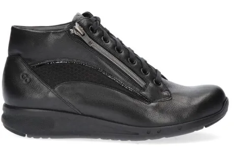 Boot van Durea op de Go leest in zwart leer met aan de zijkant mesh inzet en een bijna platte sleehak. Aan de binnenzijde zit een rits waardoor die makkelijk is aan en uit te trekken. De innovatie van de Go zool zorgt voor een ideaal looppatroon en stimuleert daarmee een natuurlijke houding van het lichaam waarbij het lopen vergemakkelijkt wordt. De schoenen zijn lichter van gewicht, soepel met dragen en zorgt voor veel demping en stabiliteit. Uitermate geschikt bij een hallux valgus, hallux rigidus, hielspoor, peesplaatontsteking en reuma. Goed te verstellen met een veter, daarbij is de boot gemaakt op een gebroken wijdte dwz dat de schoen in de hielpartij smaller is, waardoor die extra goed om de hiel sluit. De zool is van PU en de hak is 1,7 cm hoog. Gemaakt op een brede H wijdte op de leest 685. Uiteraard heeft de boot een stevig contrefort en een uitneembaar voetbed. ||Durea is een Nederlands fabricaat, met diverse leesten en wijdtematen. Het ontwerp en de afwerking geschiedt in Drunen. De productie vindt in het buitenland plaats, waar Durea fabrieken bezit, onder toezicht van eigen mensen. Iedere schoen ondergaat ca 200 handelingen, Daar Durea alles in eigen beheer heeft kunnen zij hun hoge kwaliteit waarborgen. Durea koopt u online bij Ruttenschoenen.nl