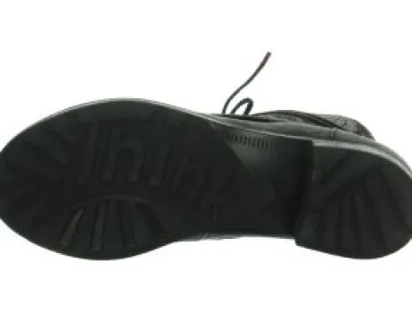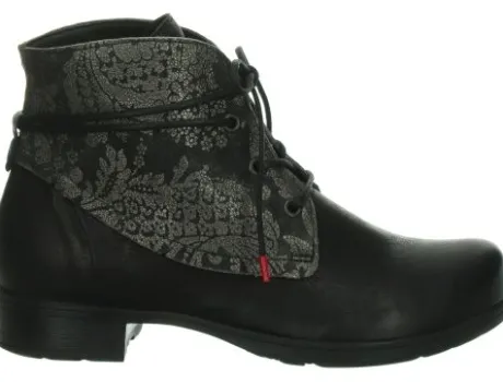 Boot van Think in zwart leer met een grijze kap met een fantasie print. De boot heeft een bijna platte hak en een profielzool. Gemaakt op de leest Denk! deze leest heeft extra ruimte bij de tenen in de breedte. Think maakt niet echt wijdtematen, maar is vaak geschikt voor een vollere voet. De voetbedden zijn uitneembaar en is dus geschikt voor eigen steunzool. ||Think is een merk uit Oostenrijk en kenmerkt zich door aparte ontwerpen, met een prima pasvorm, gemaakt uit de beste leersoorten, die vaak plantaardig gelooid zijn.