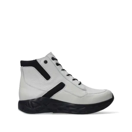 Boot van Wolky in wit leer met zwarte accenten op de leest Pro. Dit is een brede ronde leest die veel ruimte bij de tenen heeft. De boot is verstelbaar met een veter en aan de binnenzijde zit een rits waardoor die makkelijk aan en uit te trekken is. Deze boot is licht van gewicht en biedt veel comfort en heeft een comfortabele dikke zool die extra helpt bij het afwikkelen. De voetbedden zijn uitneembaar en ze zijn dus geschikt voor uw eigen steunzool. ||Wolky is een Nederlands merk, wat grotendeels in Portugal geproduceerd wordt. Ze hebben vaak een wat bredere leest en bieden ook vaak goed ruimte bij de tenen. Kenmerkend zijn de zachte zolen waarop u verend loopt. Het lopen op wolken effect. Wolky wordt dan ook vaak als zeer comfortabel ervaren. Ze hebben vaak een wat bredere leest en bieden ook vaak goed ruimte bij de tenen. Kenmerkend zijn de zachte zolen waarop u verend loopt. Het lopen op wolken effect. Wolky wordt dan ook vaak als zeer comfortabel ervaren. Wolky koopt u off en online bij Ruttenschoenen.nl
