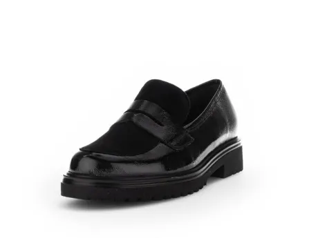 Sportieve instapper van Gabor in zwart lak met een suede spiegel op een wijdte H op de leest Davos. Over de wreef zit een sierband en de schoen heeft een lage brede hak. De voetbedden zijn uitneembaar. ||Gabor is een Duits fabricaat, met diverse leesten en wijdtematen. Ze staan bekend om hun goede leesten en zachte leersoorten. Modisch comfortabel tegen betaalbare prijzen. Sommige hebben een uitneembaar voetbed. Gabor koop je online bij Ruttenschoenen.nl